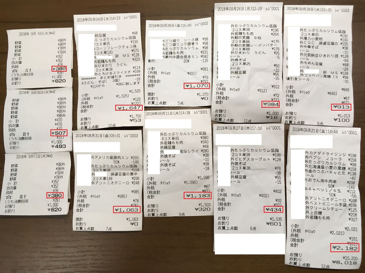 1ヶ月間買い物のときにレシートを保管して集計しました。