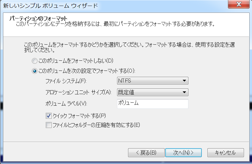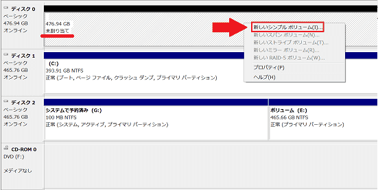 未割り当て領域を右クリック→「新しいシンプルボリューム」