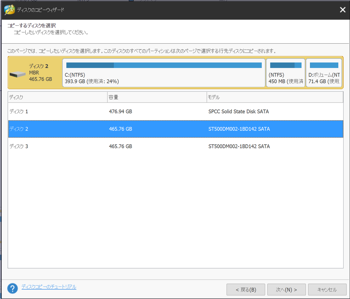 手順3:Cドライブのクローン作成