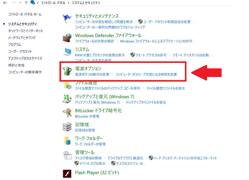 ②「システムとセキュリティ」→「電源オプション」