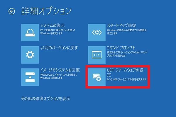 ※この手順で「UEFIフォームウェアの設定」が出ない場合もあります。