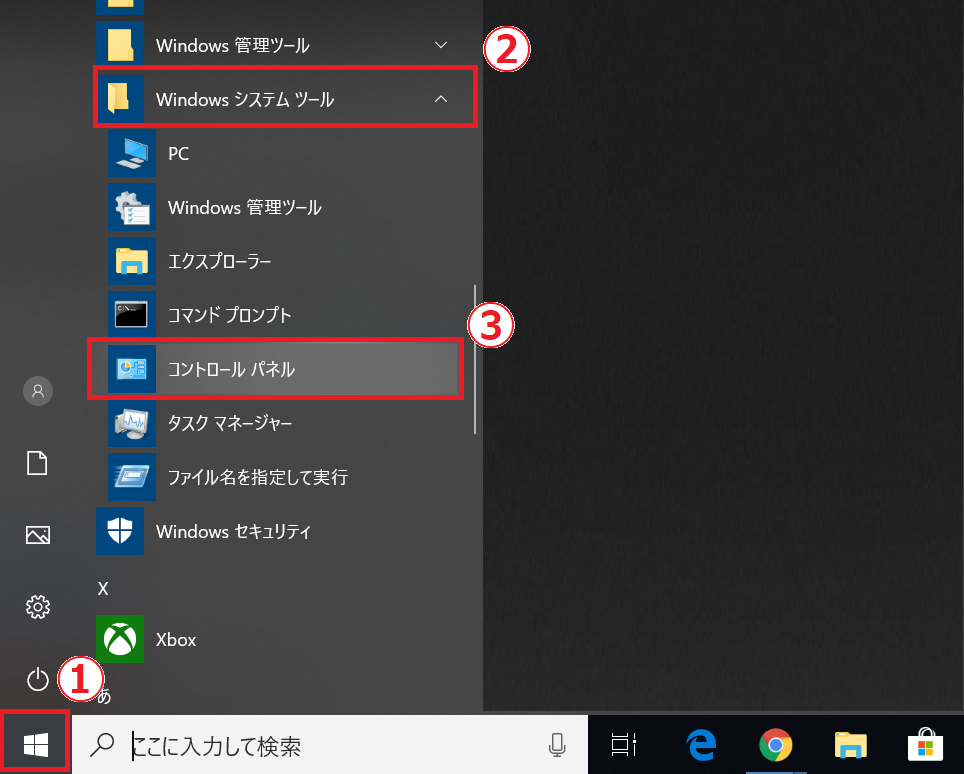 ①「スタート」→「Windowsシステムツール」→「コントロールパネル」